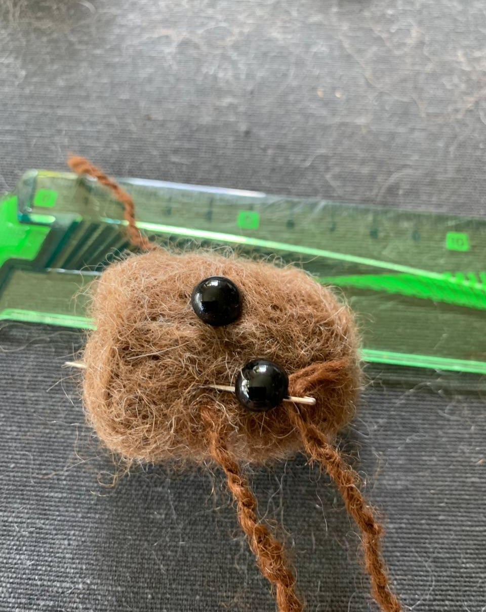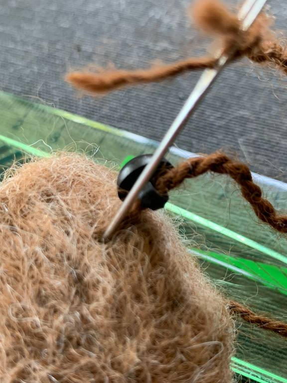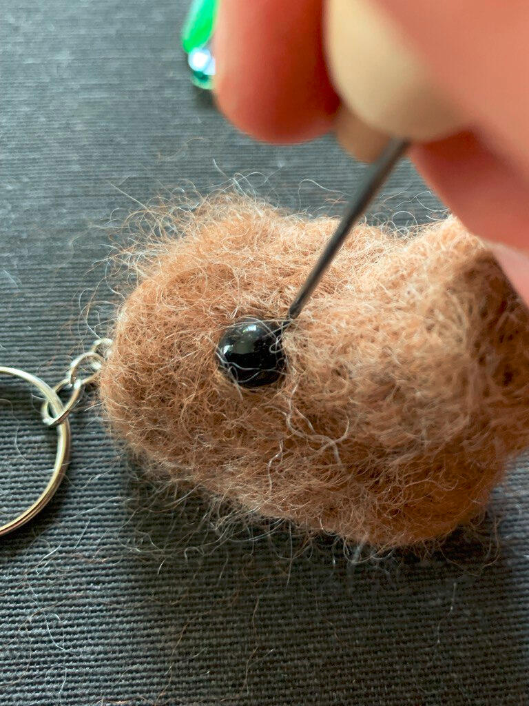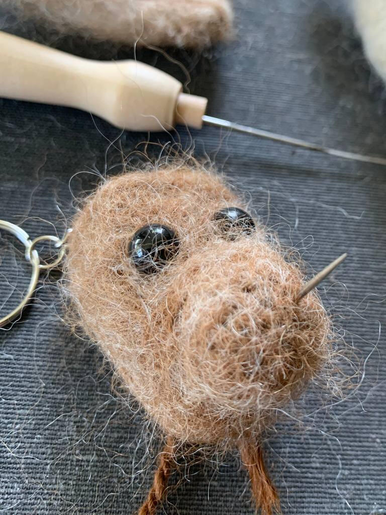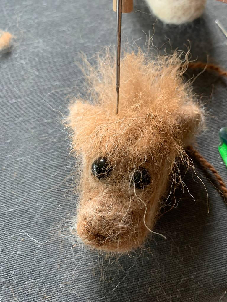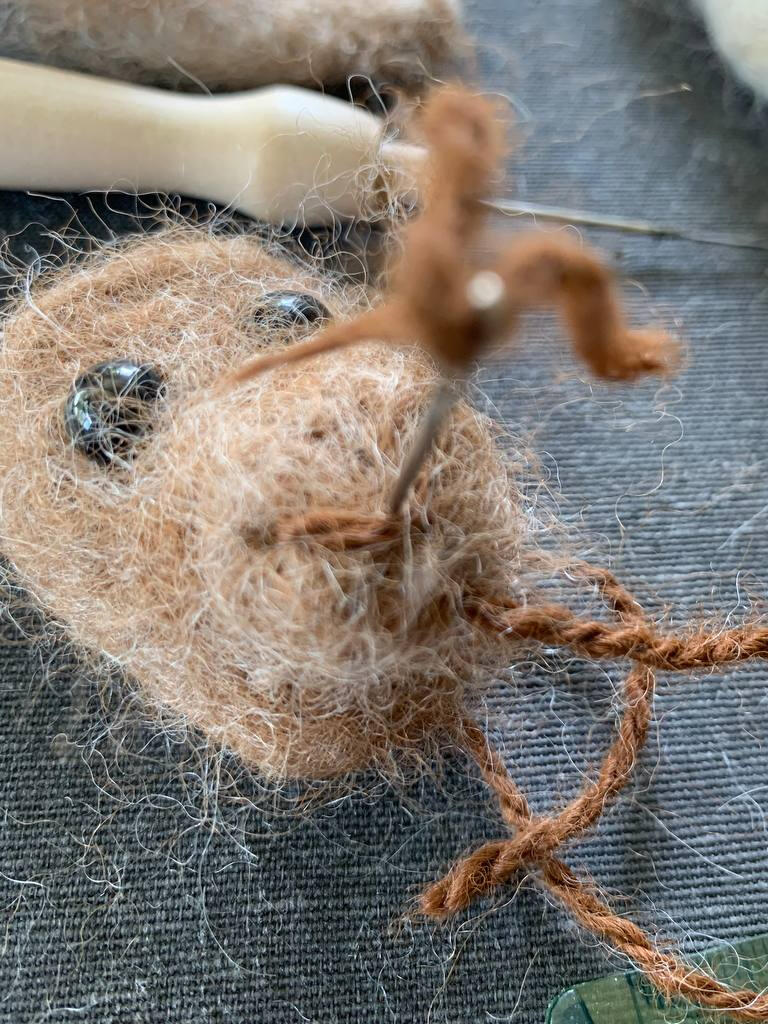 Maak de ogen terug vrij door met de viltnaald de wol die op de ogen ligt, opzij te schuiven en vast te prikken. Vind je de neus te zwaar, dan kan je een stuk afknippen en met een nieuw fijn laagje wol bedekken. Vind je ze net niet zwaar genoeg kan je extra wol toevoegen tot je tevreden bent.