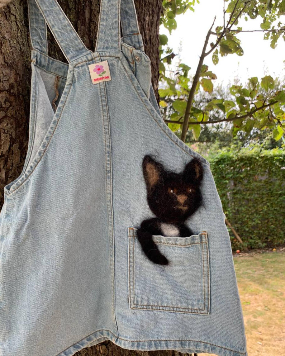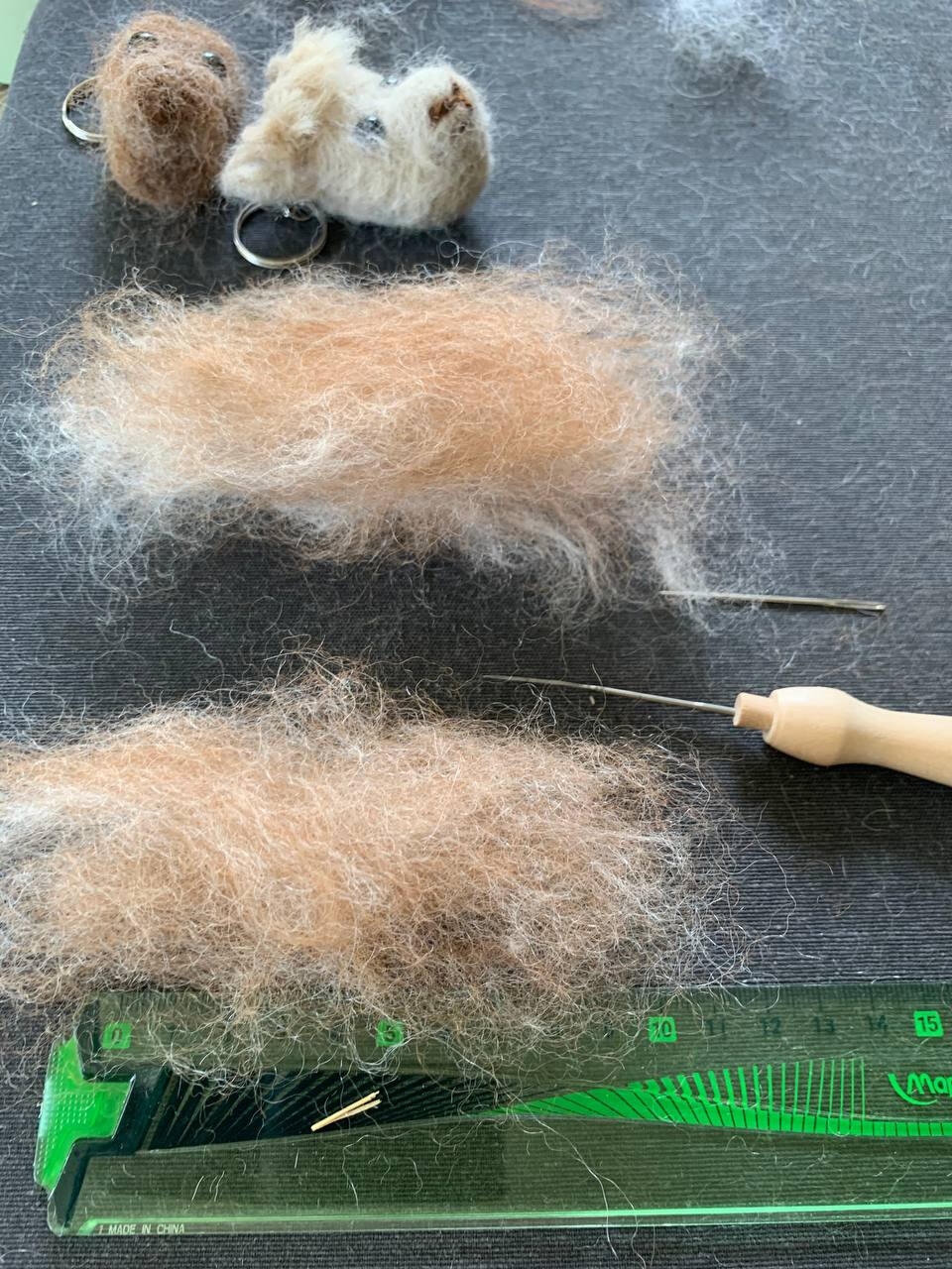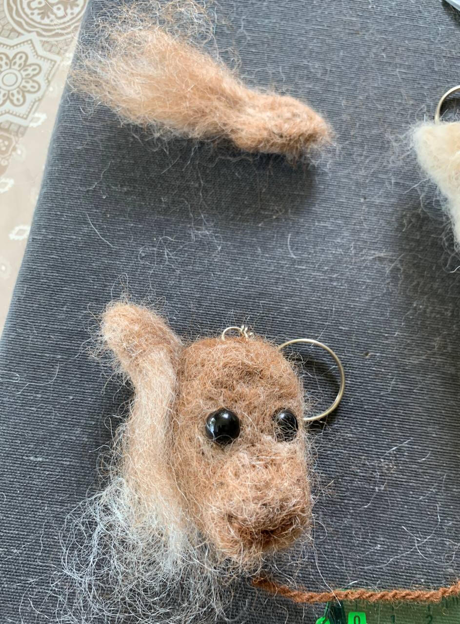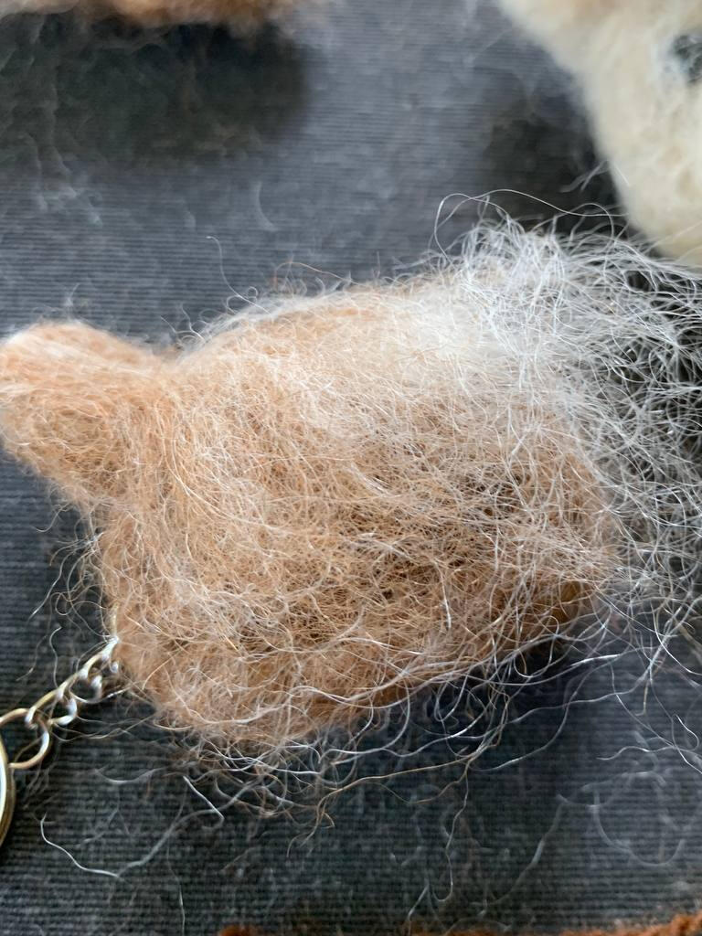 Maak de ogen terug vrij door met de viltnaald de wol die op de ogen ligt, opzij te schuiven en vast te prikken. Vind je de neus te zwaar, dan kan je een stuk afknippen en met een nieuw fijn laagje wol bedekken. Vind je ze net niet zwaar genoeg kan je extra wol toevoegen tot je tevreden bent.
