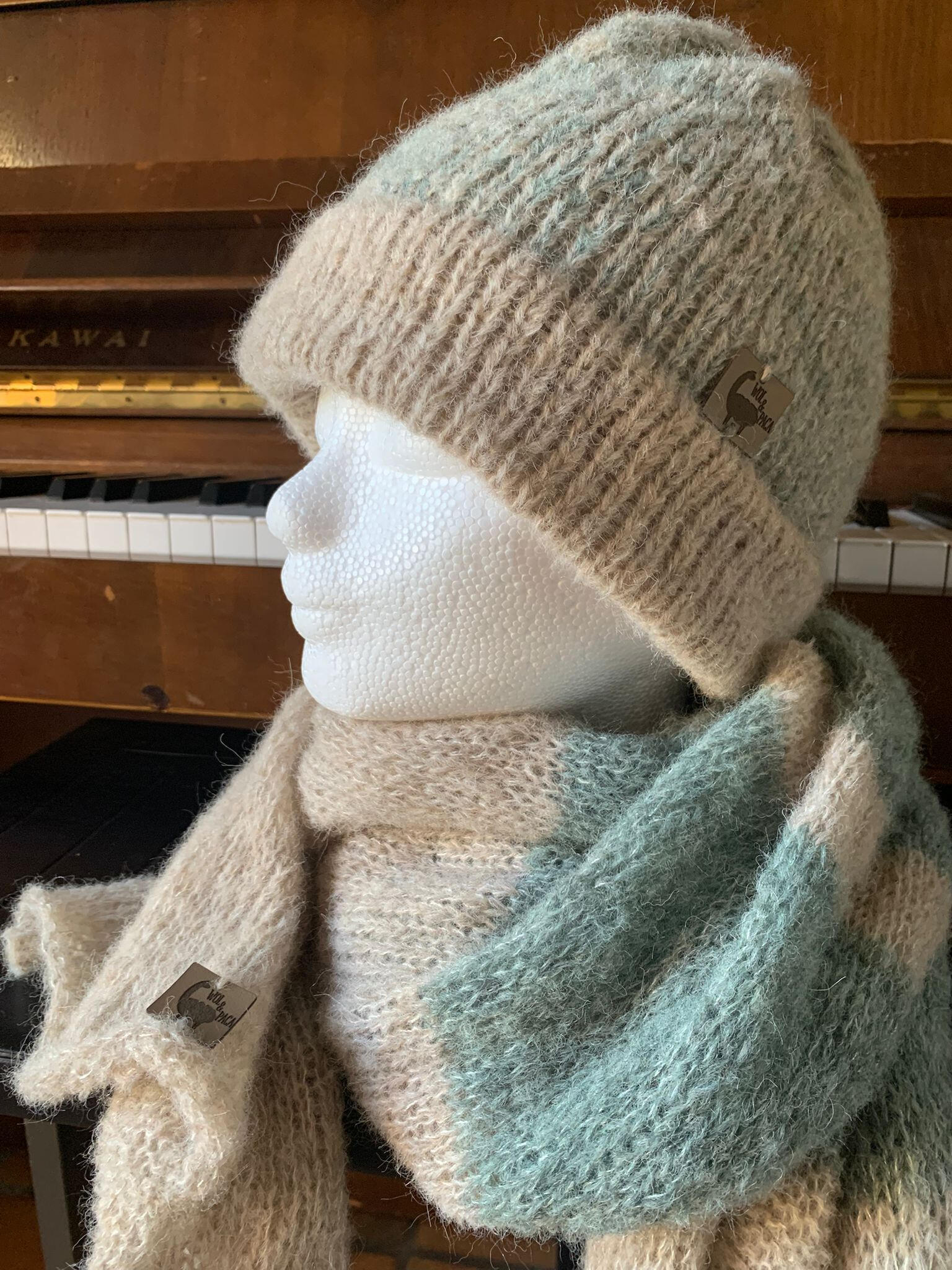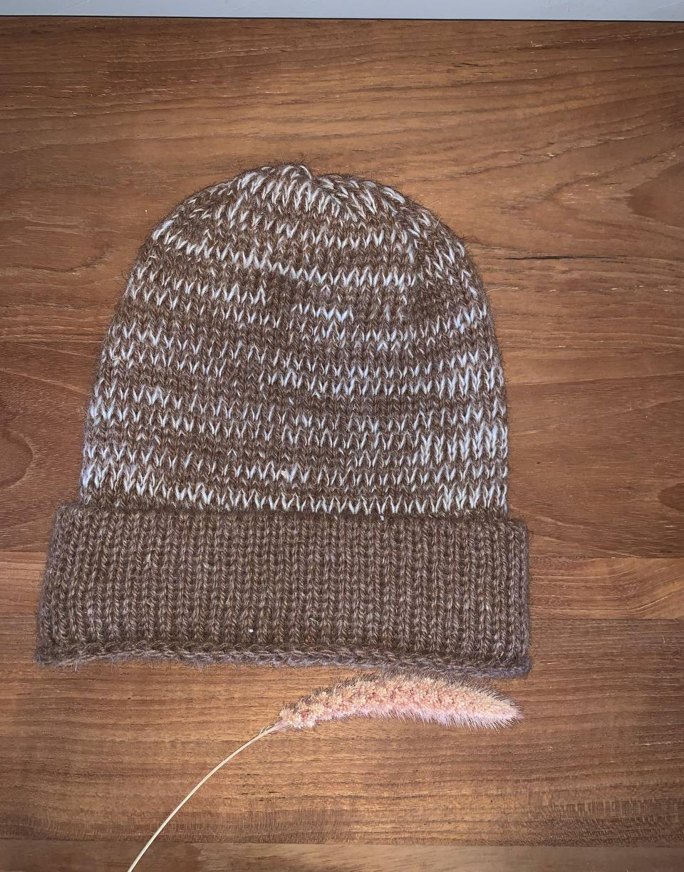 Onze wol werd gesponnen in Flanders Fibermill, een ecologische spinnerij in Maarkedal. We lieten verschillende samenstellingen spinnen. Zuivere alpacawol is immers heel zacht maar de vezel op zich biedt voor breiwerk onvoldoende structuur. Daardoor zou het breiwerk na verloop gaan "uitzakken". Door schapenwol bij de alpacawol te voegen, krijgen we een stabiel garen. Omgekeer verzachten we onze schapenwol door er alpacawol aan toe te voegen. Voor elk wat wils dus. Zo krijgen we ook nog meer variatie in de kleuren. Wij zelf breien stuk voor stuk van deze wol de mutsen, sjaals, handschoenen en accessoires. Echte slow fashion dus! Ons label is van biologisch cactusleder.