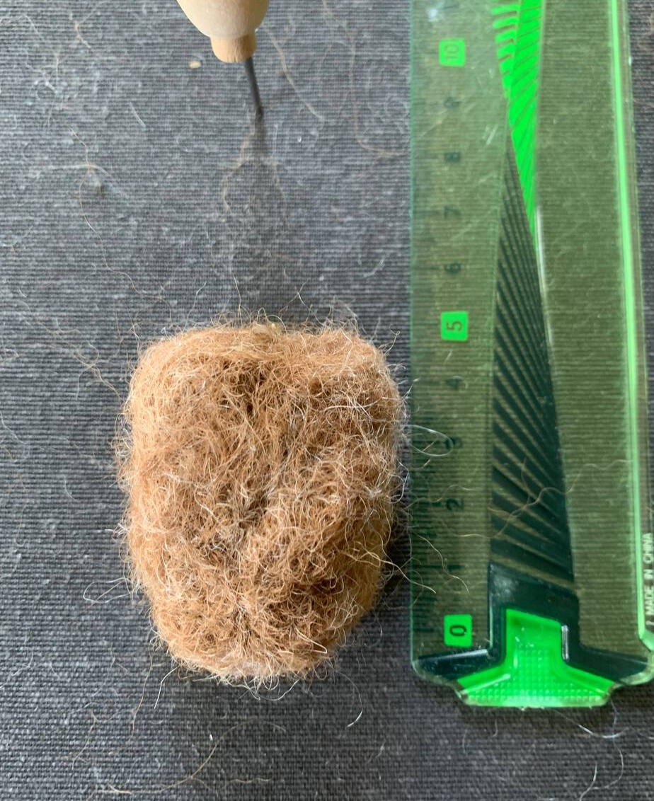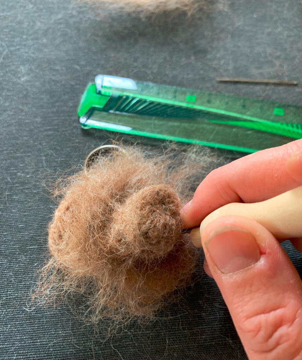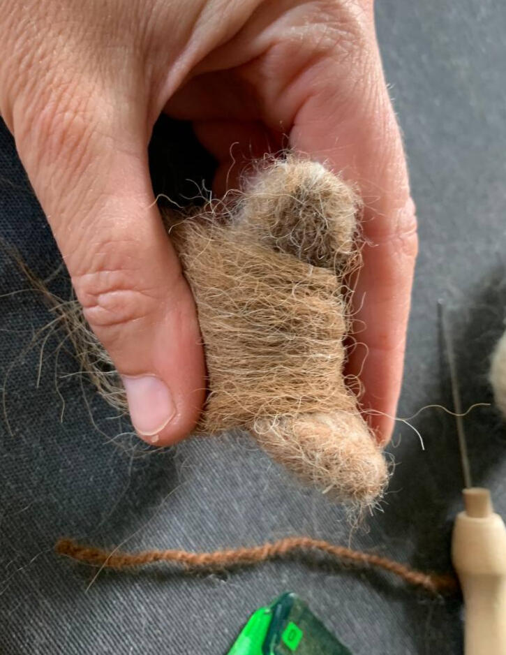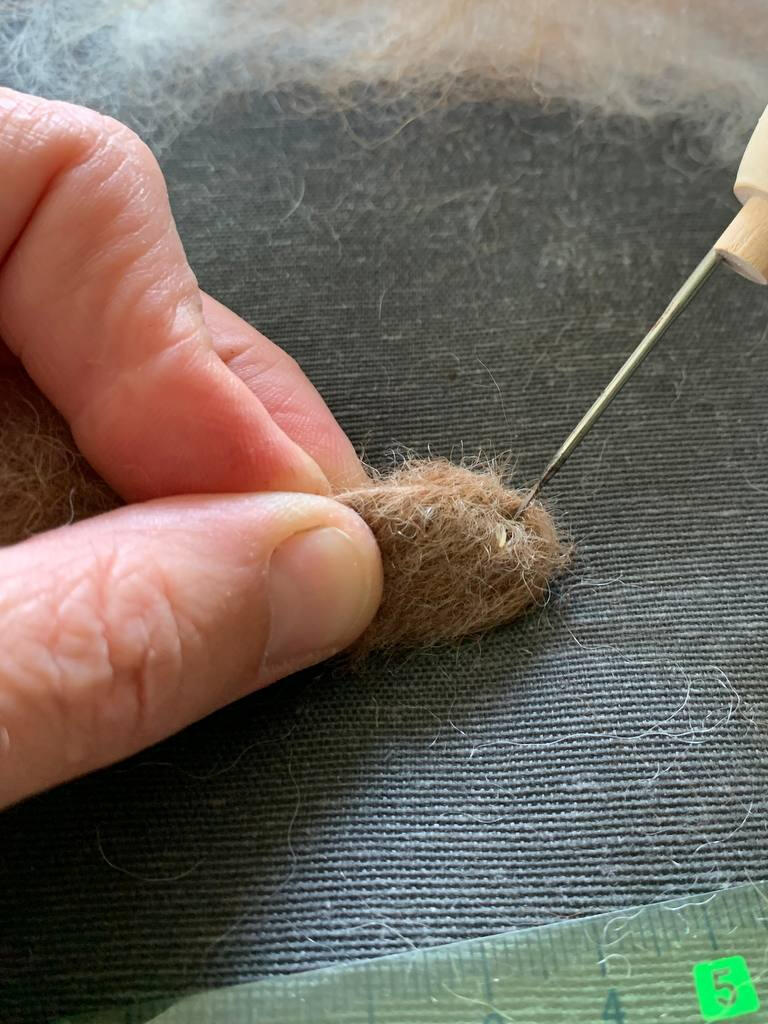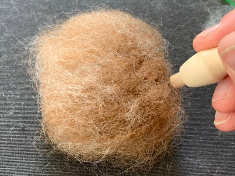 Rol dit op. Gebruik de viltnaald om de vezels in elkaar te hechten. Dit kan een tijdje duren. Hoe langer je prikt, hoe steviger je vorm wordt. Uiteindelijk moet je vorm met de helft in volume minderen. Het voelt nu vrij stevig aan. Je kan nu vorm geven aan het kopje door de onderkant samen te duwen terwijl je prikt. Zo wordt de kin iets spitser.