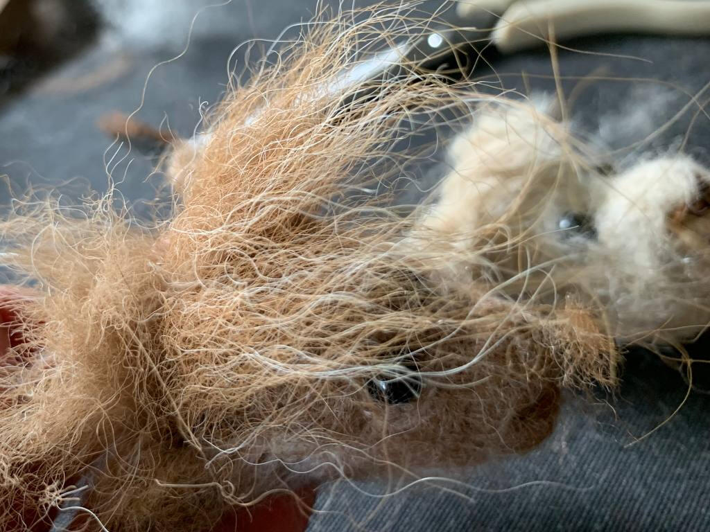 Last but not least moeten we onze vriend wat hoofdhaar geven. Hier kan je zo gek gaan als je wil. Een pluk gekamde harige wol (gebruik hiervoor een gewone kam) als je voor een harig kapsel wil kiezen, of neem van de fluffy wol als je voor fluffy gaat. Verdeel de wol over de bovenkant van het hoofd. Prik het haar vast op 1 lijn tussen beide oren.