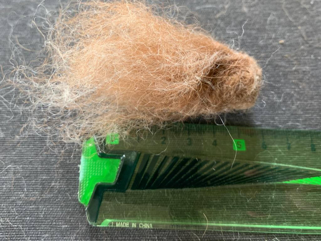Vervolgens maken we de neus. Neem een kleine hoeveelheid wol (ongeveer 1/10 van wat je gebruikte voor de kop). Maak een rolletje en vilt de neus. De wol aan de achterkant van de neus laat je los, die hebben we nodig om de neus op de kop te bevestigen.